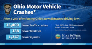 (COLUMBUS, Ohio)— Ohio Governor Mike DeWine announced today that traffic crashes in Ohio significantly decreased in the year since enforcement of Ohio’s strengthened distracted driving law began. Local peace officers and the Ohio State Highway Patrol (OSHP) began enforcing Ohio’s new distracted driving law in October 2023, following a six-month grace period for motorists. The law prohibits all drivers, in …