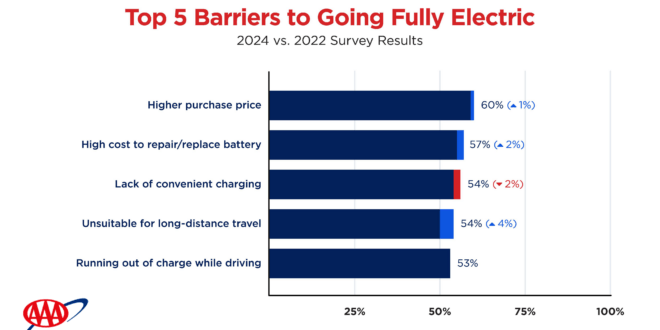 AAA found the main hesitations in purchasing an EV continue to be cost, lack of convenient charging options, and range anxiety. Three in ten also cited the inability to install a charging station where they live.