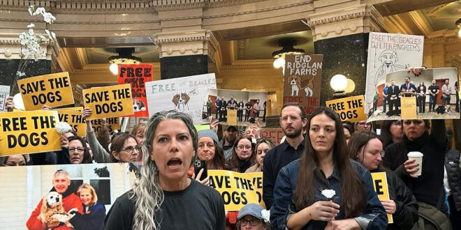 Animal welfare activists converged outside of Wisconsin Gov_ Tony Evers’ Capitol office on Monday, chanting “Free the dogs!”